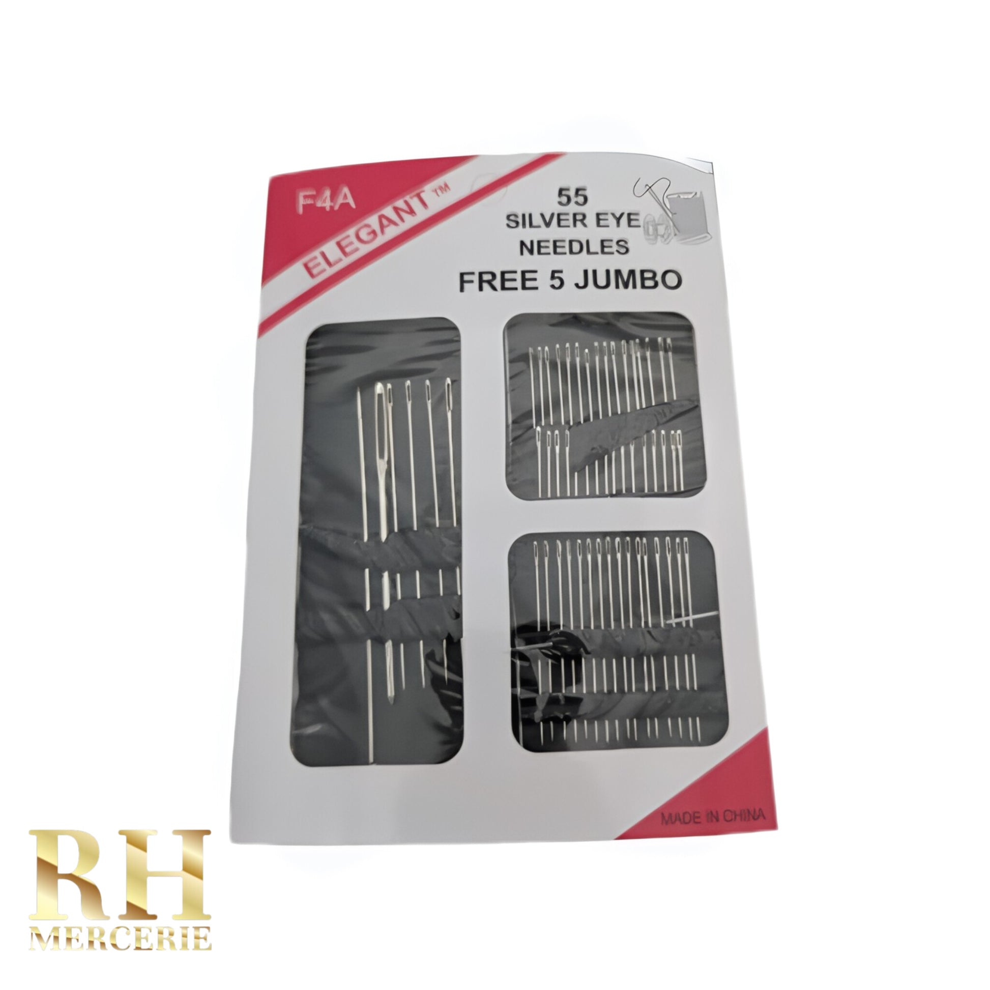 علبة تحتوي على 55 إبرة خياطة فضيّة عالية الجودة مع 5 إبر Jumbo إضافية مجانًا، مناسبة لمختلف أنواع الأقمشة والأشغال اليدوية.