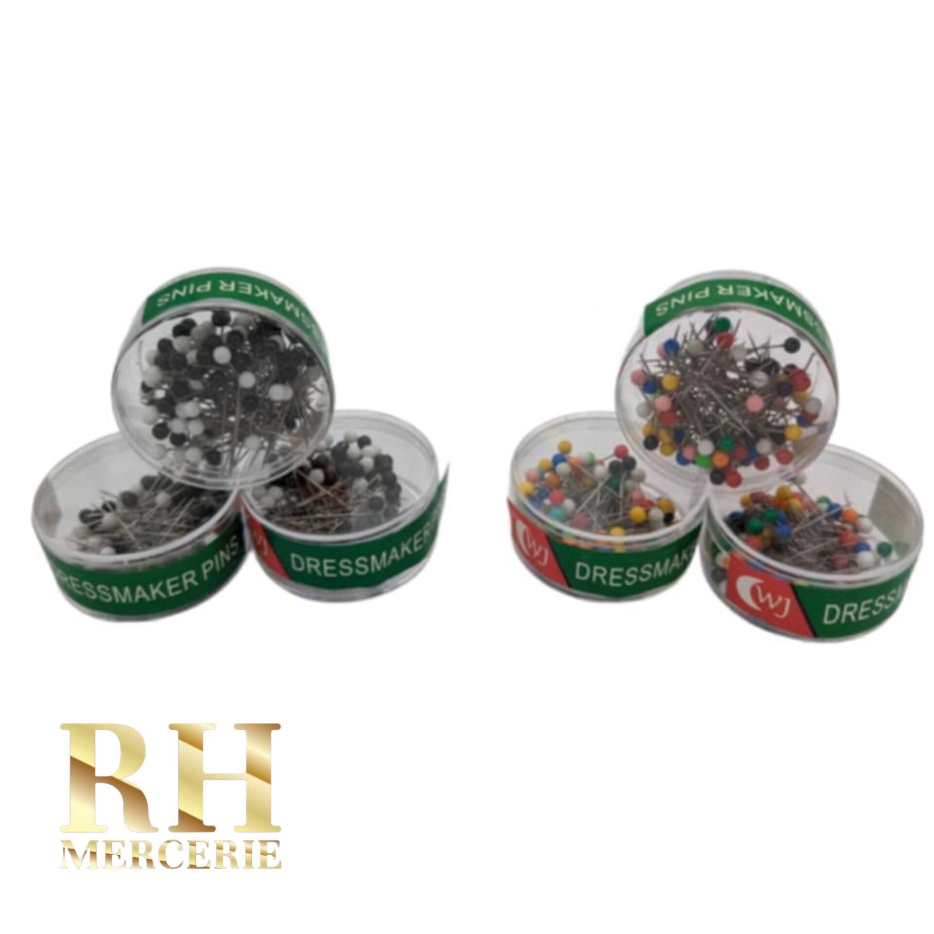 علب دائرية تحتوي على دبابيس حجاب برأس بلاستيكي بألوان مختلفة، مثالية لتثبيت الحجاب والأقمشة دون إتلافها، عملية وآمنة للاستخدام اليومي.