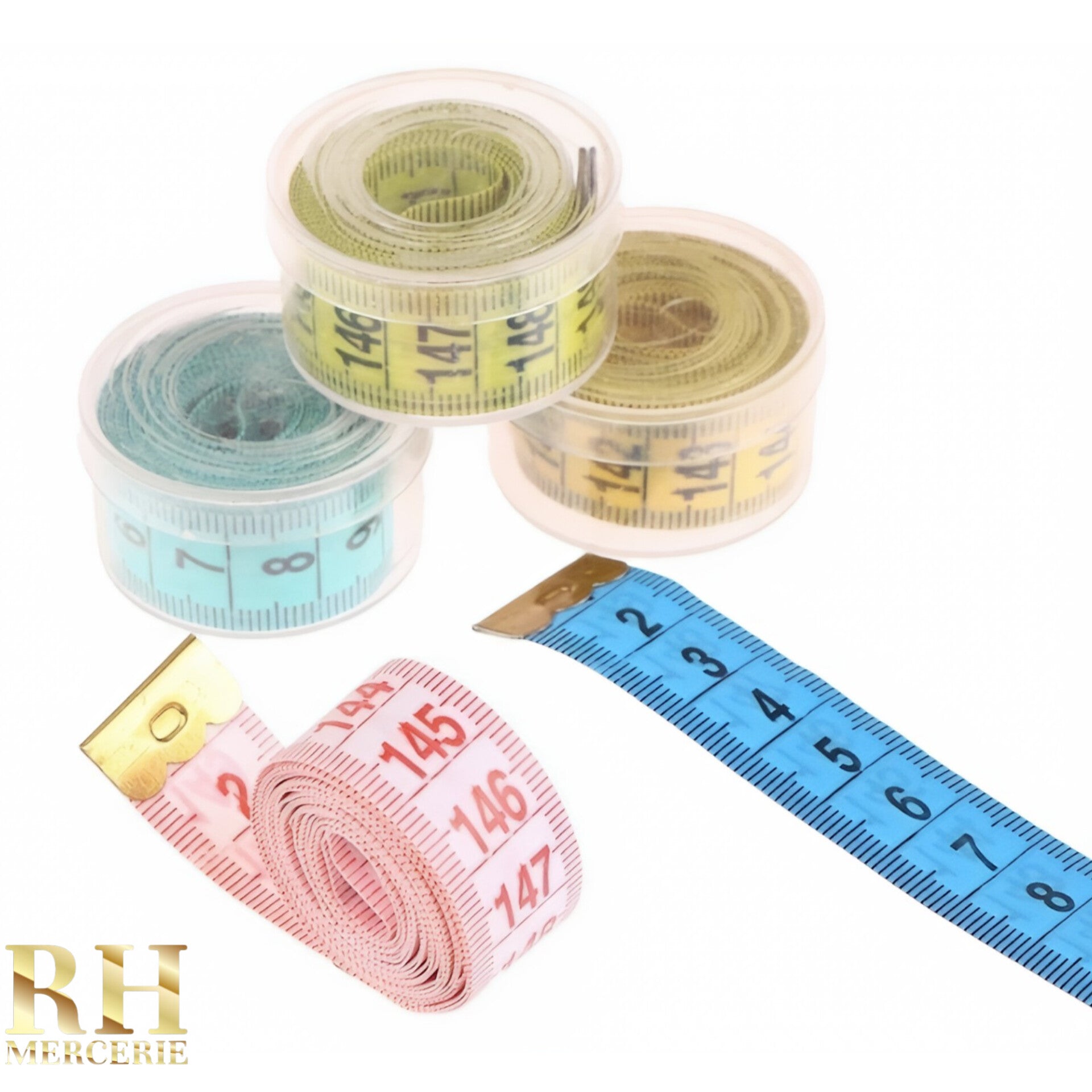 شريط قياس مرن بطول 150 سم، متوفّر بألوان متعددة، يأتي في علبة بلاستيكية لحفظه وتنظيمه، مثالي للخياطة والتفصيل بدقة.