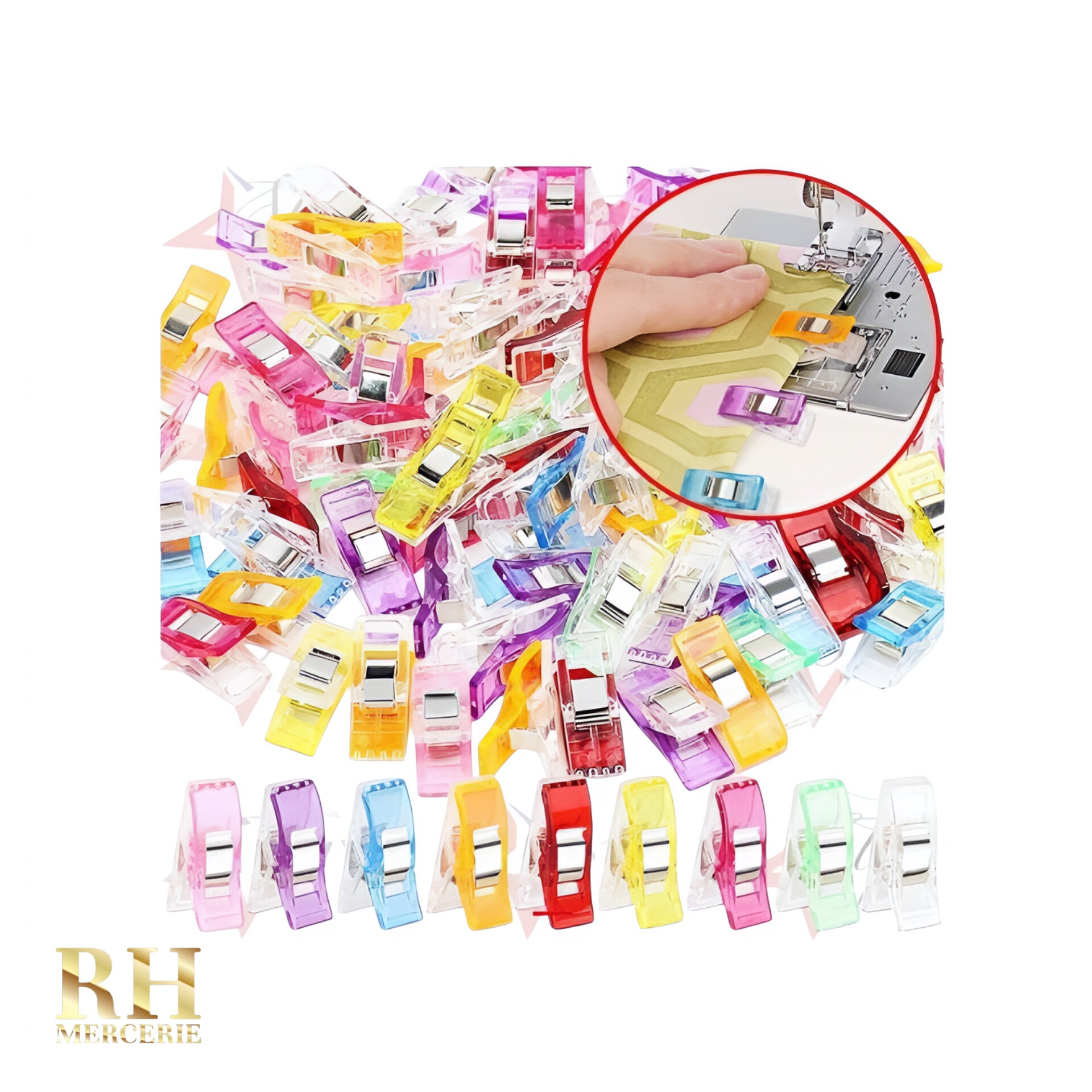 مشابك ملوّنة صغيرة لتثبيت القماش أثناء الخياطة بدل الدبابيس، مثالية للأقمشة الحساسة والعمل الدقيق.